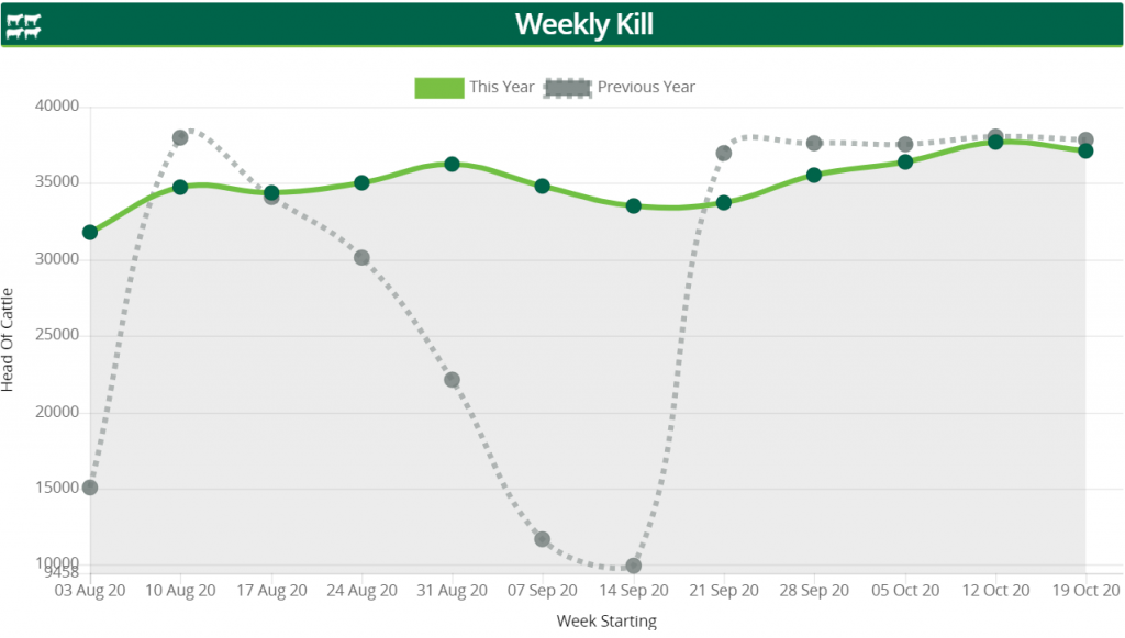 The total number of cattle processed this year so far (up to the week ending October 25) has reached 1,441,024 head. This figure is currently racing ahead of the 2019 figure (1,409,031 head).