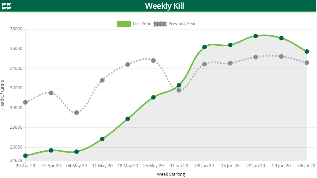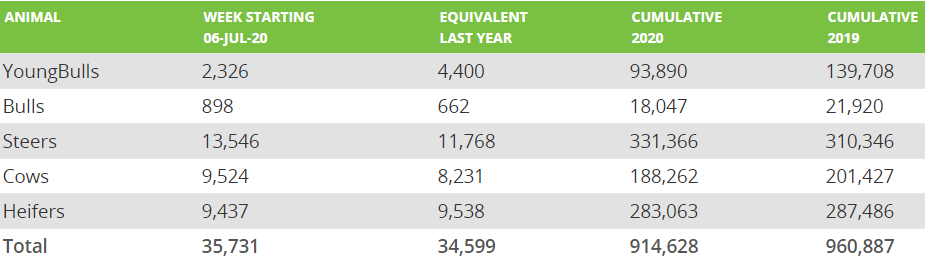 Last week, some 35,731 cattle were slaughtered in Irish beef processing plants – representing a decrease of 1,366 head on the previous week’s kill, but an extra 1,132 head when compared to the same week in 2019.