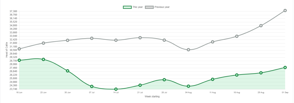 Latest beef kill figures show factory cattle supplies in the first week of September this year were 10,000 head below the same week of last year.