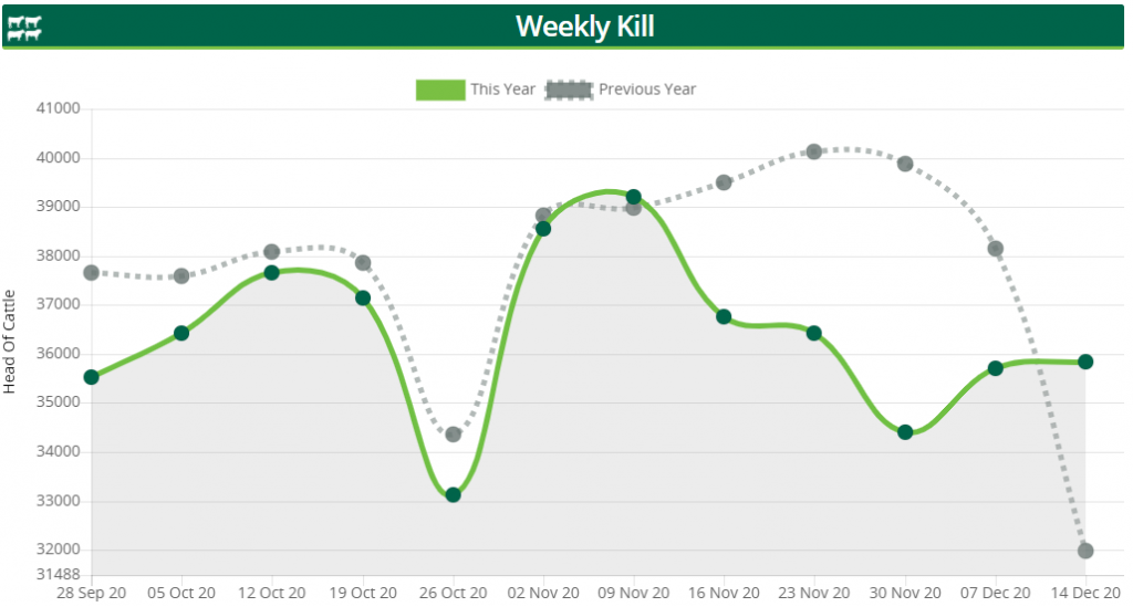 For the week ending December 19, there was a total of 35,840 head of cattle processed – which has experienced a weekly increase of 138 head. Comparing the to the same week last year, weekly throughput is ahead this year by 3,852 head.