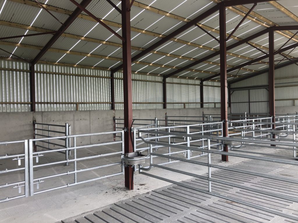 In three bays of the shed, where his suckler cows will be housed, he installed diagonal feed barriers, while in the other two pens, where his finishing cattle will be housed, he installed two barriers going parallel to each other and left a gap between the concrete slab and the barriers – so that the cattle can fit their heads out.
