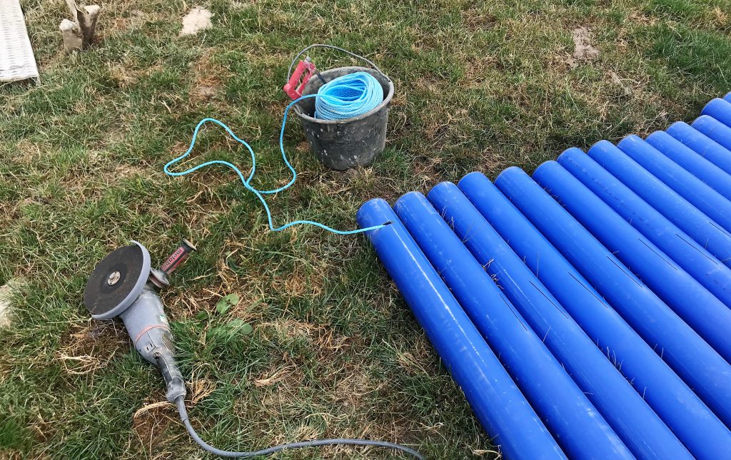 From here, plastic pipes – with slits – are lowered via a rope through the steel piping; the slits allow water to enter. The ‘top-line’ is closed over and is left ready for the pump and piping to be installed.