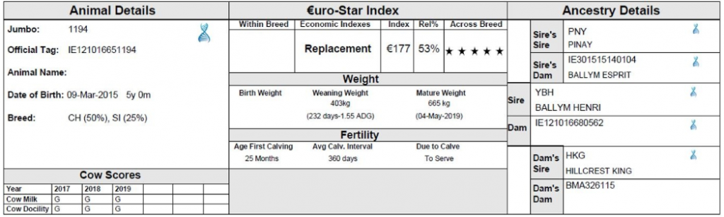 She currently has a Replacement Index of €177 with a calving interval figure of 360 days and her first daughter has been retained in the herd for breeding.