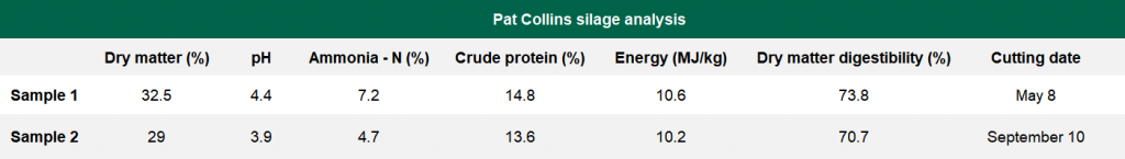 Pat’s Teagasc Green Acres Calf to Beef Programme dedicated advisor – Seán Cummins – recently took silage samples from two pits on the Co. Cork holding; the first sample was taken from silage harvested on May 8, while the second sample was taken from silage ensiled on September 10.
