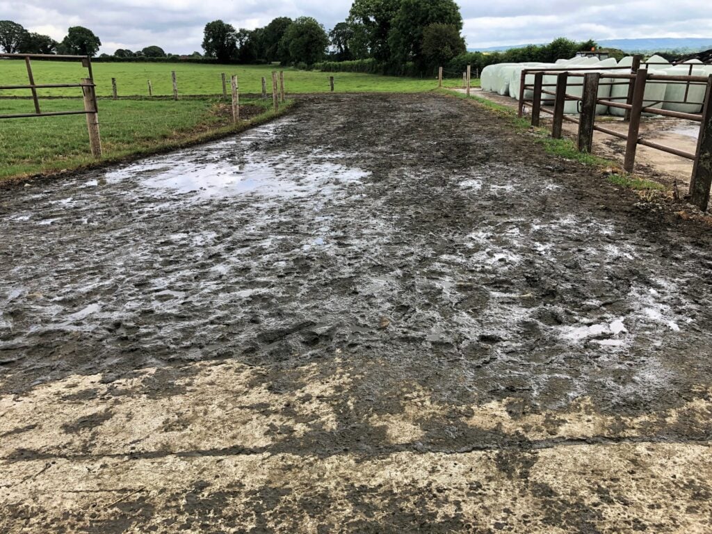The farm pass entering the back of the collecting yard is wide – approximately 7-8m in width. It also has a large rounded bend approaching the collecting yard.