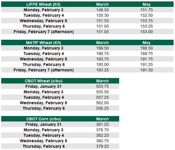 This week’s grain market figures for the LIFFE wheat, MATIF wheat and Chicago Board of Trade (CBOT) wheat and corn are listed below.