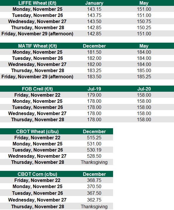 In France, MATIF wheat hit €183.50/t (December) yesterday afternoon, November 29. This rise on recent weeks may be put down to a struggle to plant winter crops in France and a decline in the quality of crops that are currently established. Some farmers are holding onto stocks as a result and in turn tightening supplies.
