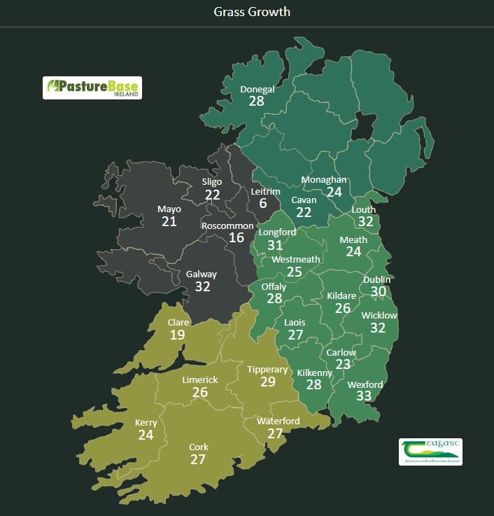 Grass growth for the country is averaging 25kg DM/ha for the north, 30kg DM/ha for the east, 27kg DM/ha for the west and 26kg DM/ha for the south.