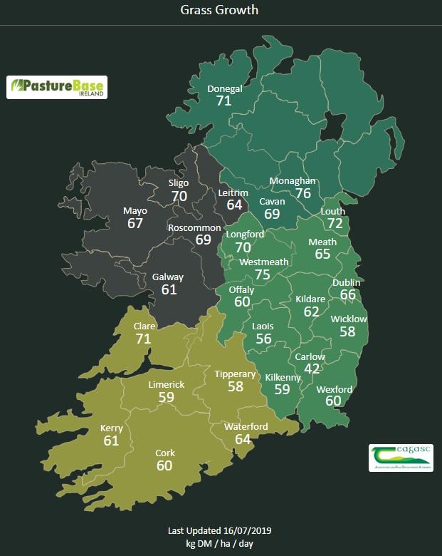 In terms of average grass growth rates, PastureBase Ireland figures are showing 72kg DM/ha in Ulster, 62kgDM/ha in Leinster, 64kg DM/ha in Connacht and 60kg DM/ha in Munster.