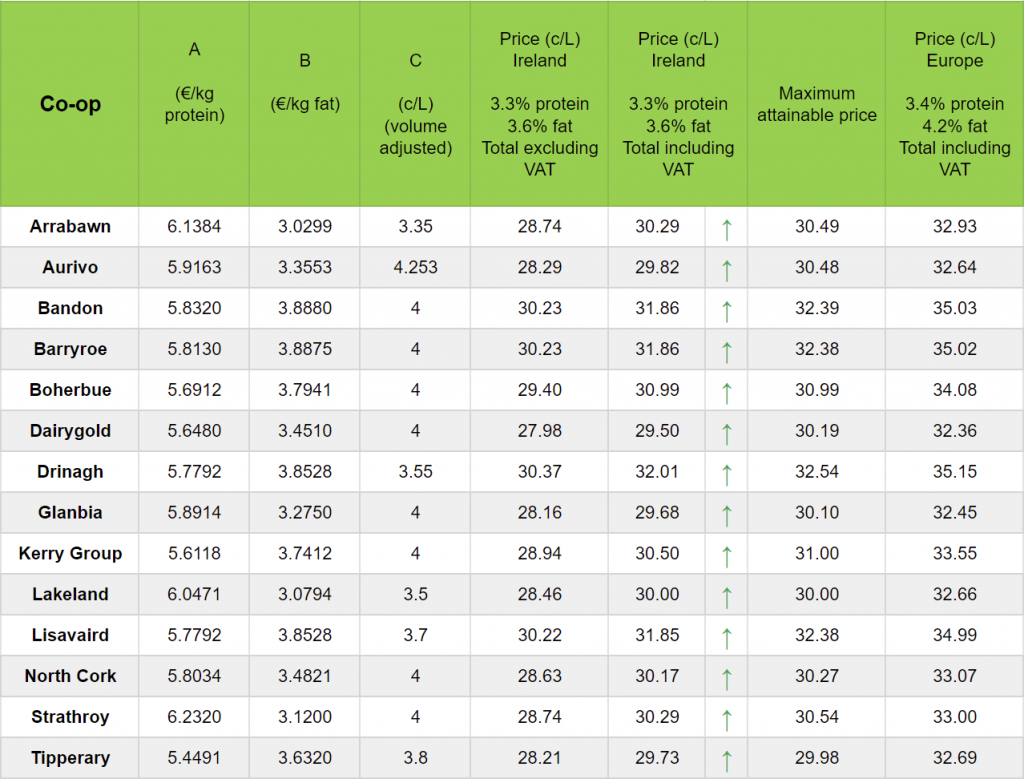 For each co-op, a green arrow indicates an increase in milk price (compared with the previous month); a blank space signifies no change; and a red arrow indicates a drop in milk price.