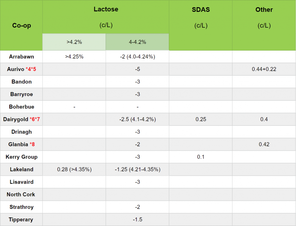 The milk prices in this table (below) are those quoted by co-ops for the month of June (2020).