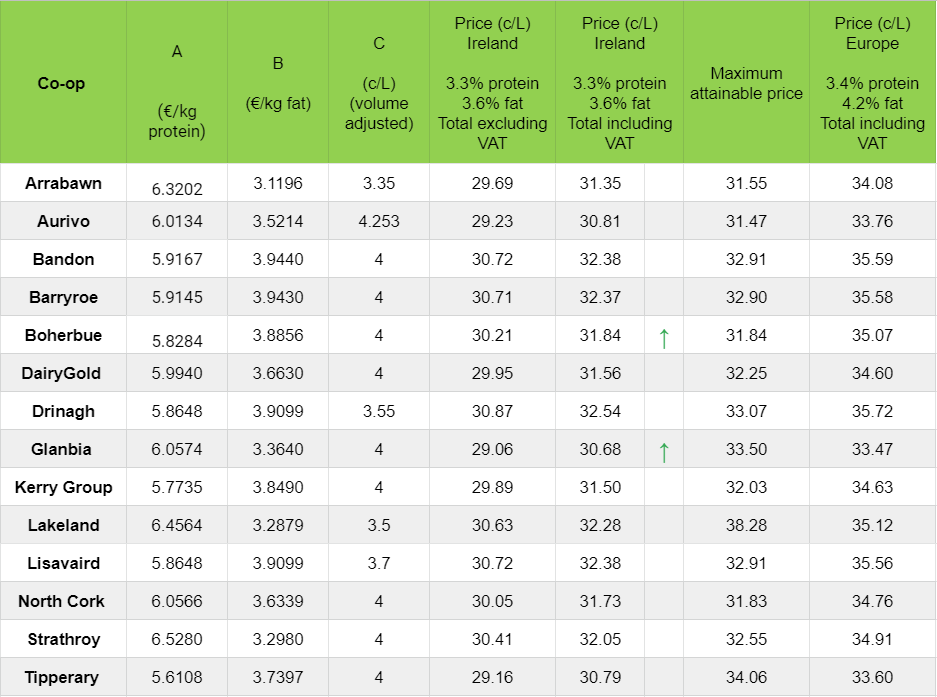 For each co-op, a green arrow indicates an increase in milk price (compared with the previous month); a blank space signifies no change; and a red arrow indicates a drop in milk price.