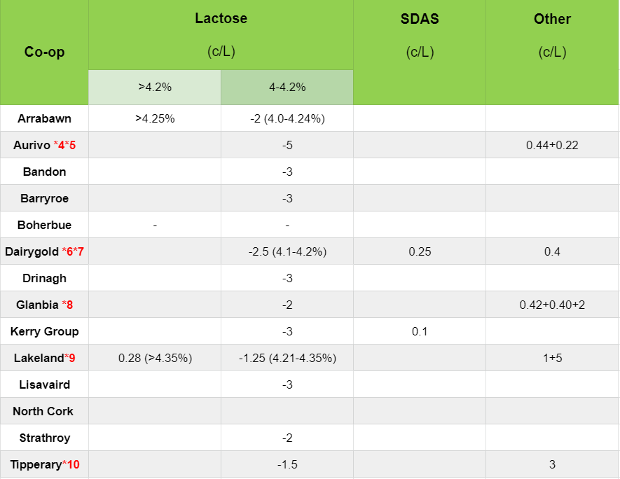 The milk prices in this table (below) are those quoted by co-ops for the month of December (2020).