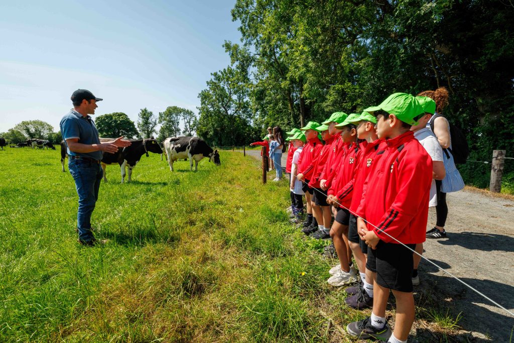 The school visit involved bringing the children through the milking process, showing the cattle coming into and going out of the parlour, and taking the group down along the cow roads to see the cows at grass.