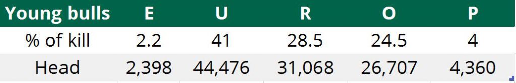 And unlike the total kill, which was dominated by O and P-grade stock, the majority of young bulls graded U (41%) or R (28.5%) at the time of slaughter.