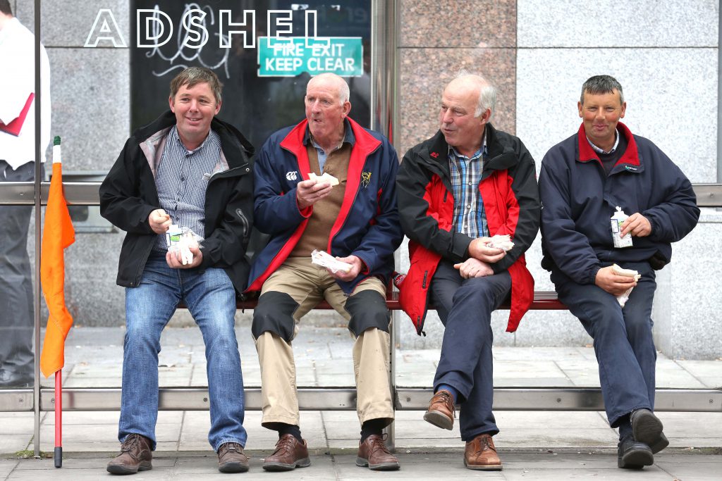 Galway farmers Enda Monaghan, Tom Costello, Michael Murphy and Tom Walsh grab a sandwich before the IFA protest of members, at the the new European office in Dublin, where a letter of was handed in demanding action on the farm income crisis across all sectors.