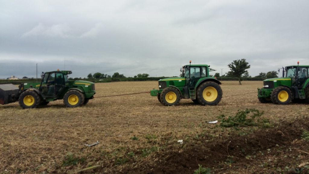 Two John Deere tractors, as well as a John Deere telehandler, were called in to help retrieve the articulated lorry from the field.