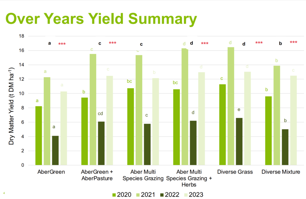 Using a multi-species and herb mix produced an extra 11.7t of DM/ha to yield a total of 47t DM/ha over the same period, or an average of 11.78t DM/ha per year. This was comparable with the nine-component mix.