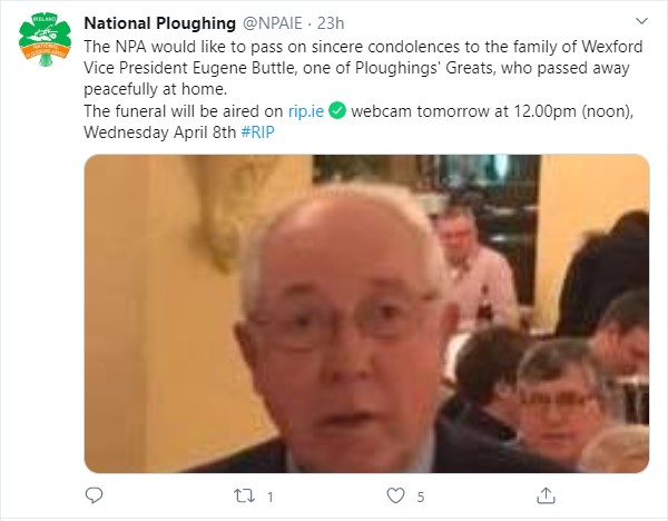 “The NPA would like to pass on sincere condolences to the family of Wexford Vice President Eugene Buttle, one of ploughing’s greats, who passed away peacefully at home.
