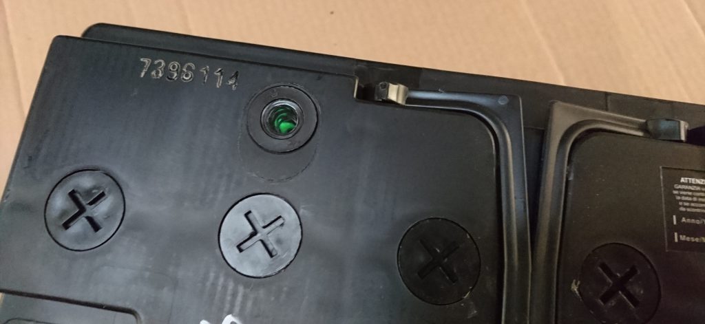 Some batteries are fitted with a so-called ‘magic-eye‘ (pictured below) – a built-in float tester that (typically) turns green when it’s fully charged. ‘Clear’ means that it needs to be charged; ‘red’ or ‘black’ indicates that it’s completely flat.